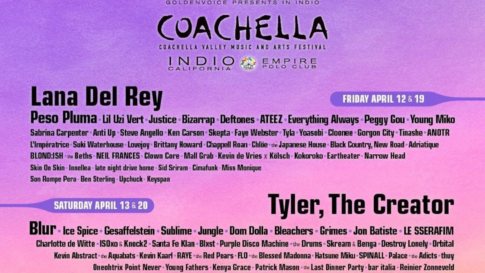 Esta edición, la número 23 del festival, se celebrará los fines de semana del 12 al 14 de abril y del 19 al 21 de abril en el Empire Polo Club, ubicado en Indio (California).