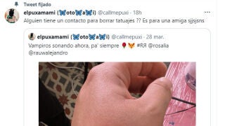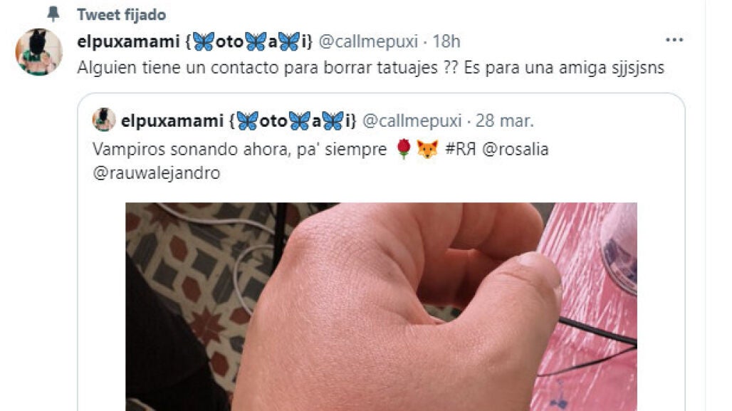 Un tuitero de Sabadell llamado @callmepuxi publicó en marzo una imagen del tatuaje que se hizo para celebrar el lanzamiento del EP de Rosalía y Rauw Alejandro. Varios meses después, justo tras la ruptura de la preja, se ha vuelto viral al publicar que está buscando alguien que borre tatuajes.