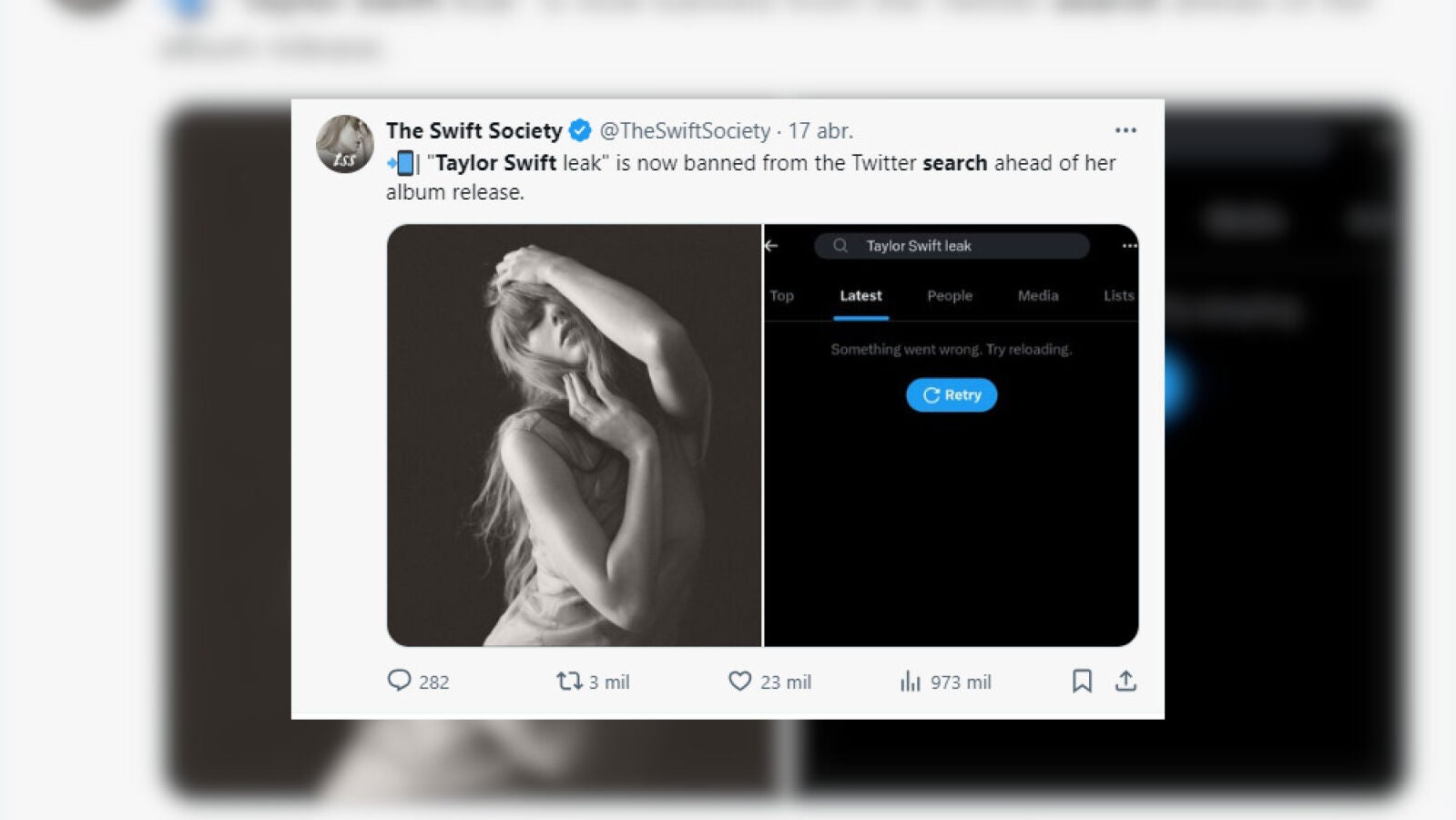 Por otro lado si buscabas la frase "Taylor Swift Leak" en Twitter no te aparece nada como si la busqueda hubiera sido prohibida por la red social para evitar que se difunda la filtración.