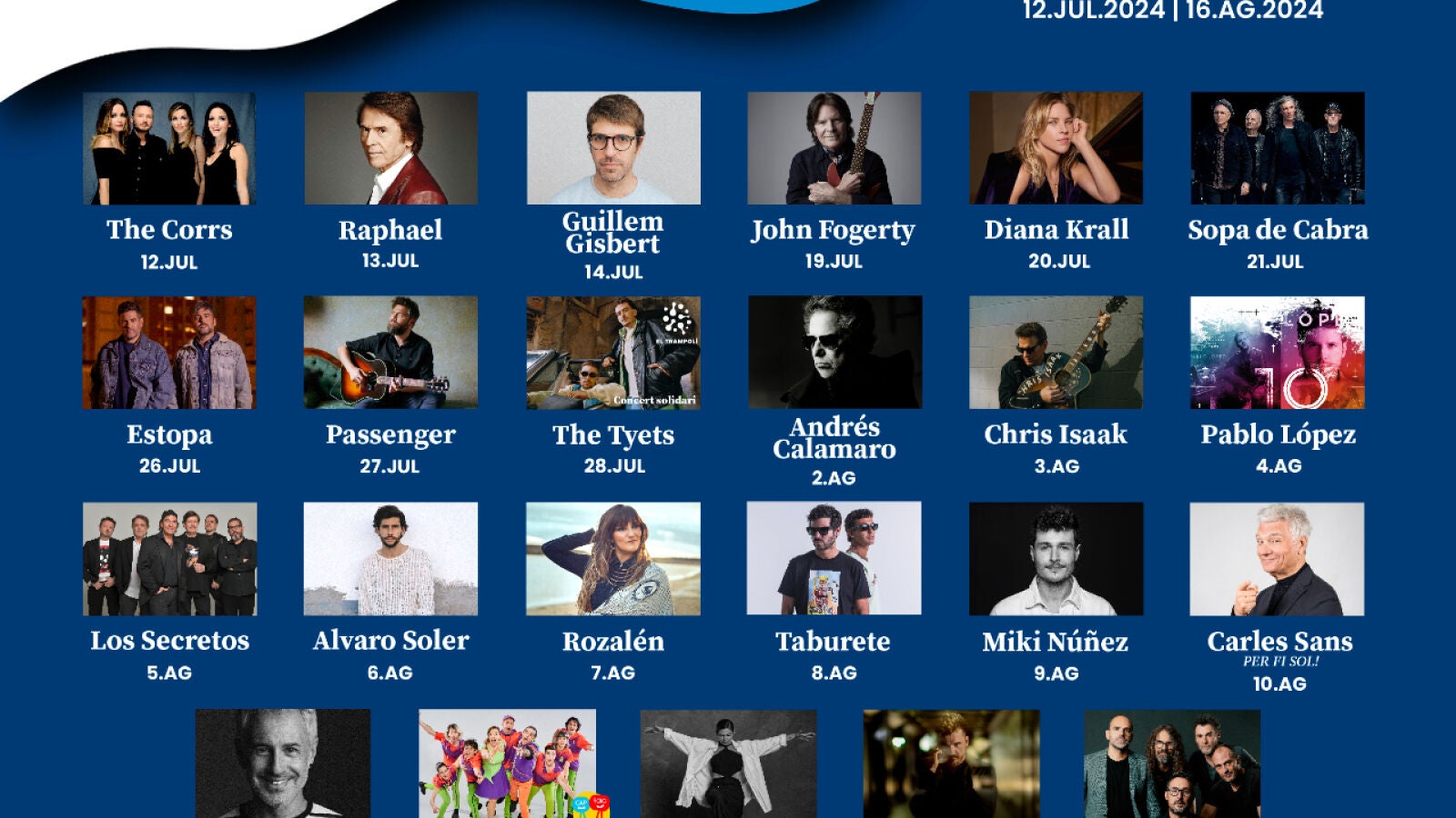 El presidente del Grupo Clipper's y director del Cap Roig Festival, Juli Guiu, anuncio el espectacular cartel con un total de 23 conciertos que incluyen a The Corrs, John Fogerty, Raphael, Guillem Gisbert, Estopa, Passenger, Andrés Calamaro, Chris Isaak, Pablo López, Rozalén, Sergio Dalma, The Tyets, Sara Baras, Diana Krall, Sopa de Cabra, Los Secretos, Álvaro Soler, Taburete, Miki Núñez, Carles Sans, Coque Malla y Gossos, mientras que El Pot Petit con La Black Music Big Band protagonizará el Cap Roig Mini de esta edición.