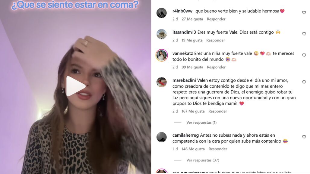 Ya recuperada y fuera de peligro, Valentina decidió compartir en redes sociales cómo vivió ese trance entre la vida y la muerte. En su testimonio explicó que lo más difícil no fue el coma en sí, sino el despertar: "Lo más fuerte fue despertar del coma y entrar a la realidad. Yo pensé que habían pasado ocho o diez horas, pero cuando me dijeron que llevaba cinco días dormida fue un shock enorme", narró.