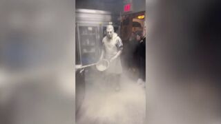 Un trabajador de un restaurante acaba lleno de harina tras recibir un tremendo susto en un restaurante de Michigan.