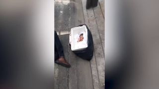 El jinete sorprendido, vestido con un chaleco naranja, pidió ayuda antes de usar la tapa de la caja para ventilar al bebé que estaba sofocado por el calor de 35 ° C.