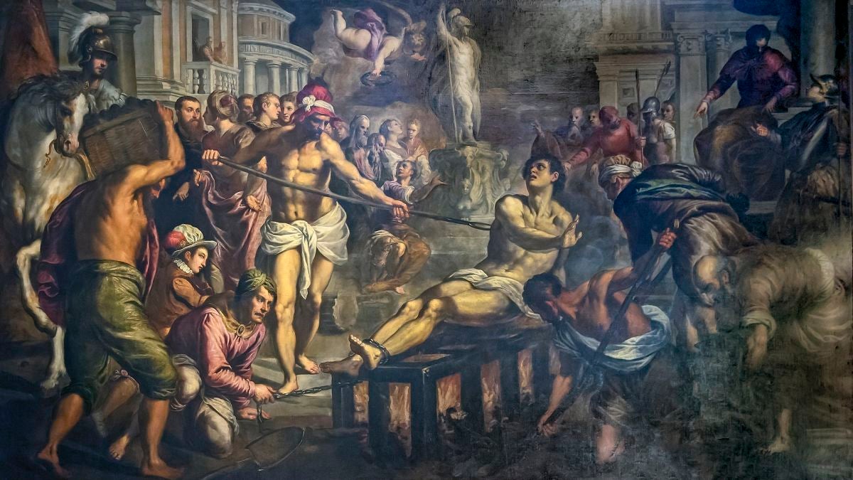 En muchas iglesias podéis ver a un bello joven casi totalmente desnudo atado a un árbol y acribillado a flechazos. Hoy es un icono gay.