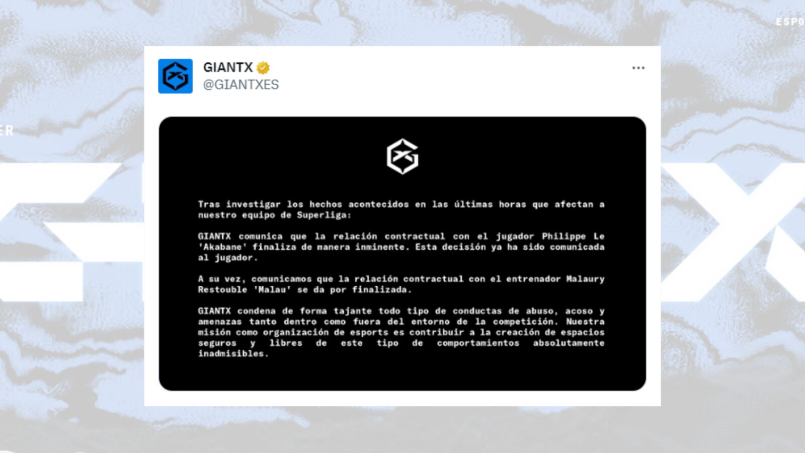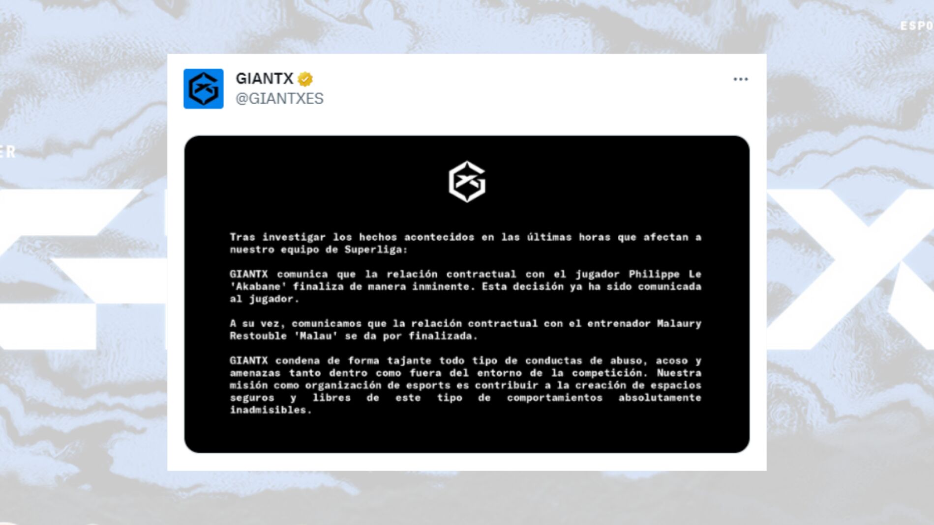Afortunadamente, GIANTX no ha tardado en actuar frente a estas acusaciones, lo que les ha llevado a finalizar su relación contractual tanto con el jugador, Akabane, como con el entrenador, Malau. Tal y como revelan en su comunicado, el equipo "condena de forma tajante todo tipo de conductas de abuso, acoso y amenazas", motivo por el que han decidido terminar de forma inminente la relación que tenían con estos integrantes de su equipo de League Of Legends.