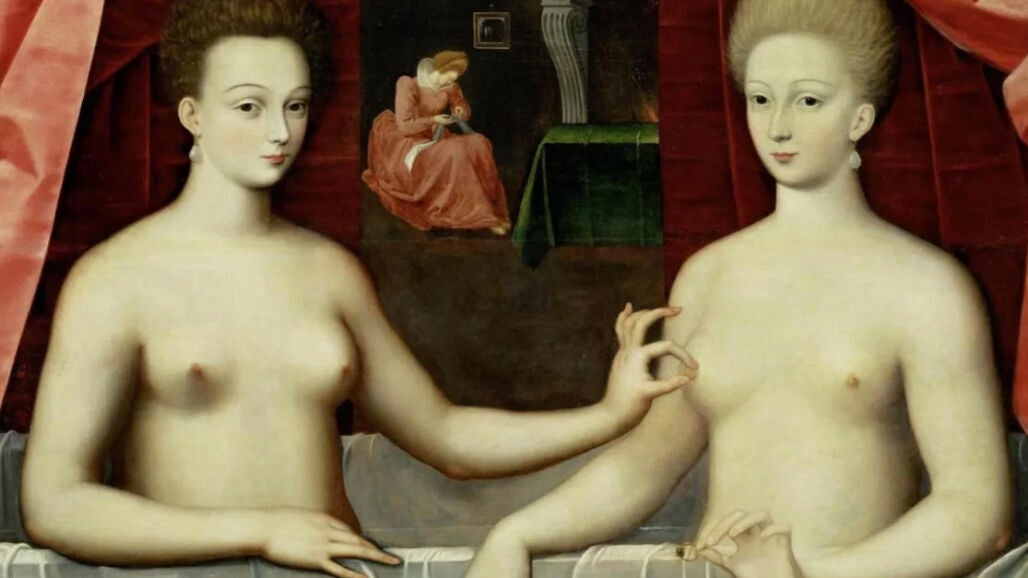 En el Museo del Louvre, no muy lejos del retrato de la Mona Lisa, hay una pintura fechada en 1594 en el que salen dos mujeres. Una es supuestamente Gabrielle d'Estrées, la amante de Enrique IV de Francia, y la otra se cree que es su prima, la Duquesa de Villars. Las caras tienen forma de pétalo, tienen la piel del mismo color que las perlas que llevan en las orejas, con sus miradas ambiguas fijadas en el observador, mientras una pellizca el pezón de la otra.