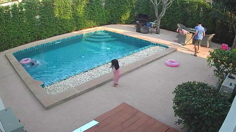La cámara de seguridad grabó el momento en que Kana Kanuengit salvó la vida de su hermana Kaning mientras jugaban junto a la piscina de la casa de familia en Chiang Mai.