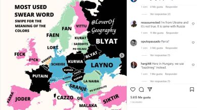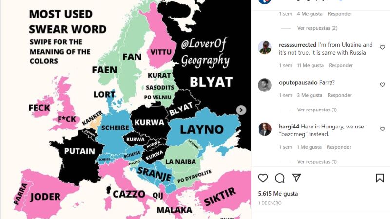 La cuenta de Instagram Love for Geography ha creado un mapa de Europa que recoge cuáles son las palabrotas más usadas en cada país, clasificándolas en cuatro grupos según su procedencia.