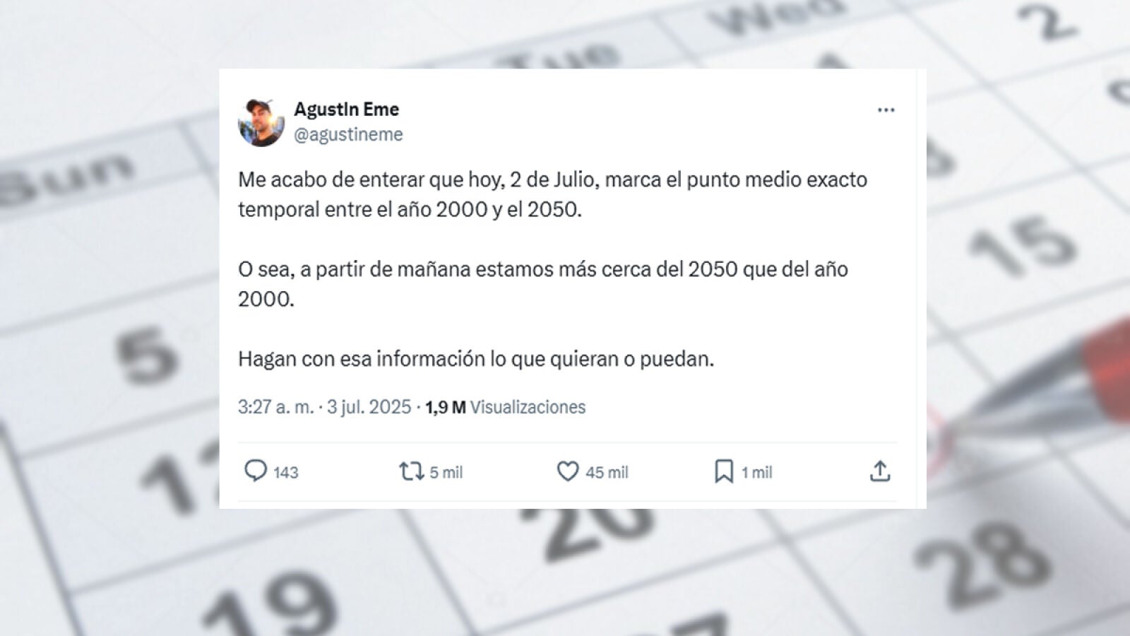 El pasado 3 de julio de 2025 marcó un punto de inflexión simbólico en el calendario: el momento exacto en que la humanidad ha pasado a estar más cerca del año 2050 que del año 2000. Un dato que invita a la reflexión sobre el paso del tiempo y los desafíos del futuro.
