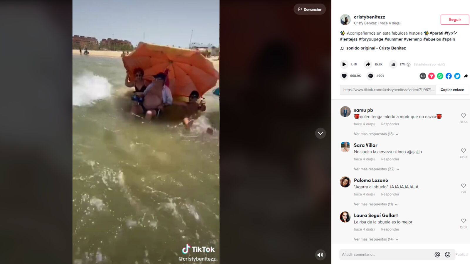 Los días de playa están para disfrutarlos. Y si no preguntar a Cristy Martínez y a su familia, quienes decidieron colocar a sus abuelos en el agua a la espera de una gran ola. La nieta subió toda la historia del día de playa en Sanlucar de Barrameda, Cádiz, con su familia a su cuenta de Tik Tok, superando la barrera de los 4 millones de reproducciones en tan solo cuatro días.