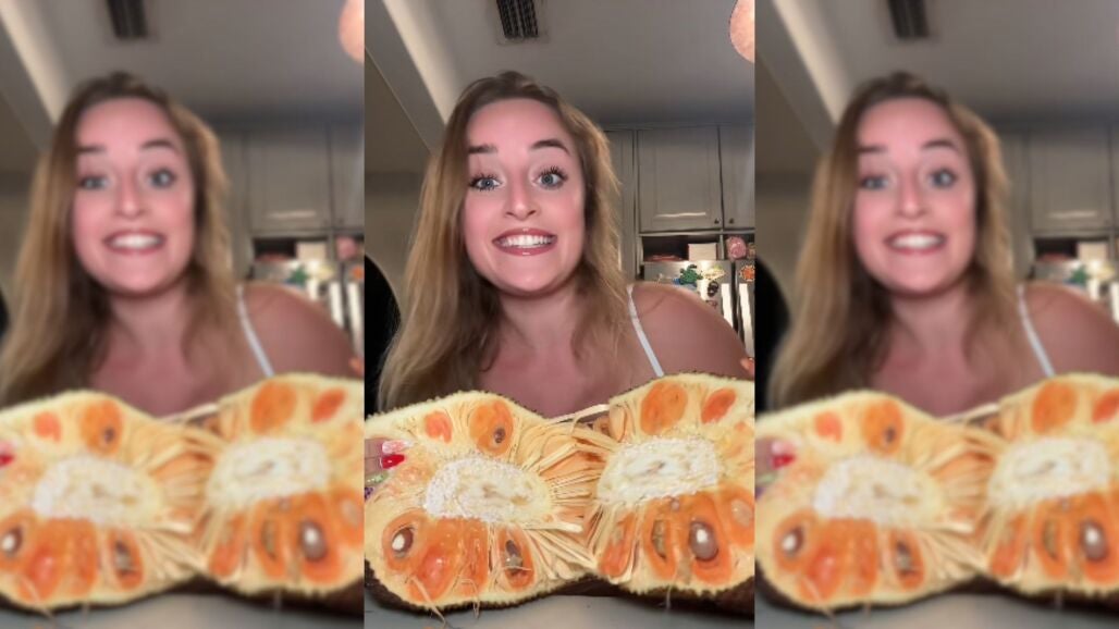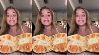 Mientras la prueba, la influencer describe la explosión de sabores que ofrece esta fruta tan inusual: "Se supone que esta fruta es una mezcla de mango, piña y tutifruti. Es como crujiente y seca, súper extraña. Está buenísima, sabe a mango y a un montón de frutas tropicales juntas".