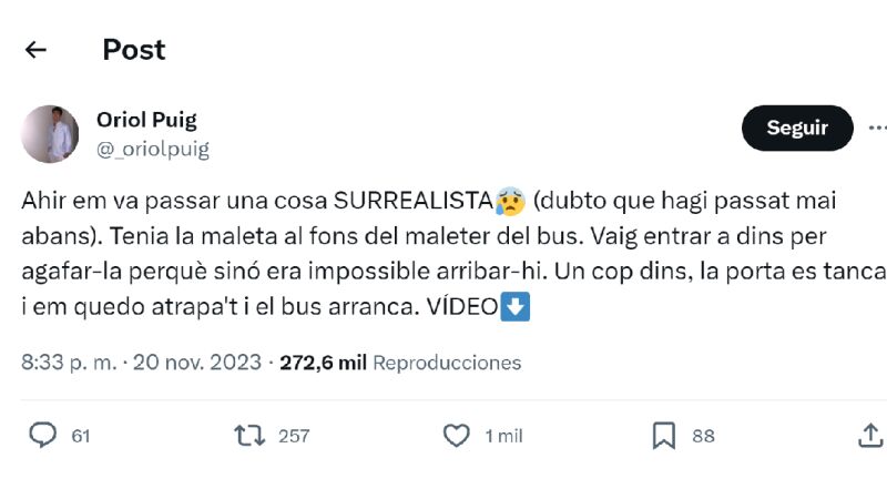 Según cuenta Oriol: "Tenía la maleta en el fondo del maletero del bus. Entré dentro para cogerla porque sino era imposible llegar a ella. Una vez dentro, la puerta se cierra y me quedo atrapado y el bus arranca".