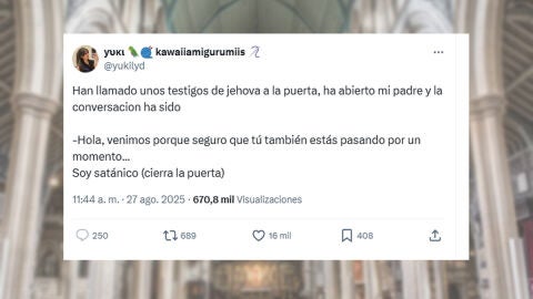 Una historia cotidiana con un toque de humor se ha convertido en tendencia en redes. La usuaria de X (antes Twitter), identificada como @yukilyd, relató que unos Testigos de Jehová tocaron a su puerta para entablar una conversación. Ante la visita inesperada, su padre respondió de una manera tan rotunda como inesperada: "Soy satánico", después de lo cual cerró la puerta abruptamente.