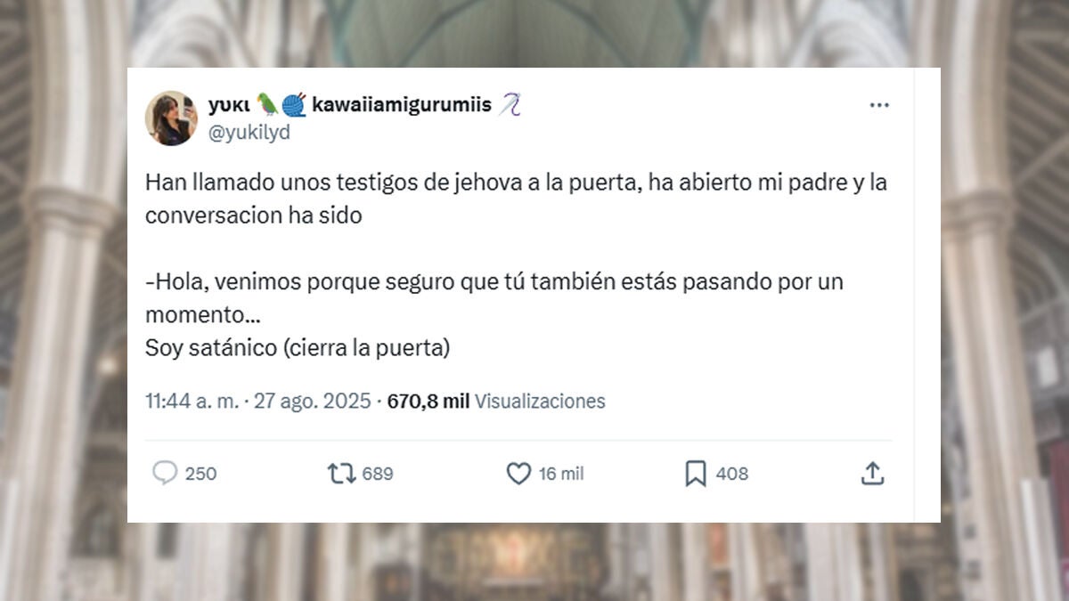 Una usuaria de X compartió una simpática anécdota en la que su padre abrió la puerta cuando unos Testigos de Jehová llamaron a su casa, respondió "soy satánico" y cerró la puerta sin más explicaciones. El tuit ha acumulado más de medio millón de visitas y generado numerosas reacciones en redes, mostrando el ingenio como vía de escape ante insistentes visitas no deseadas.
