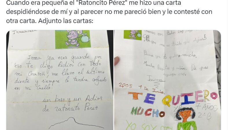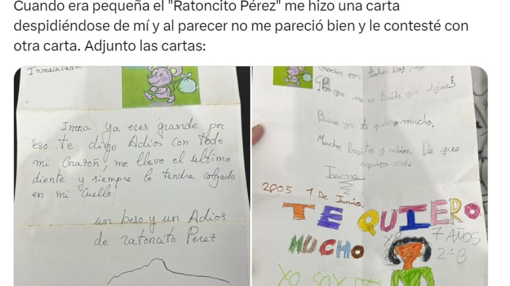 En el tuit se ve una primera carta de este animalito en la que pone: "Inma, ya eres grande, por eso te digo adiós con todo mi corazón, me llevo el último diente y siempre lo tendré colgado en mi cuello".