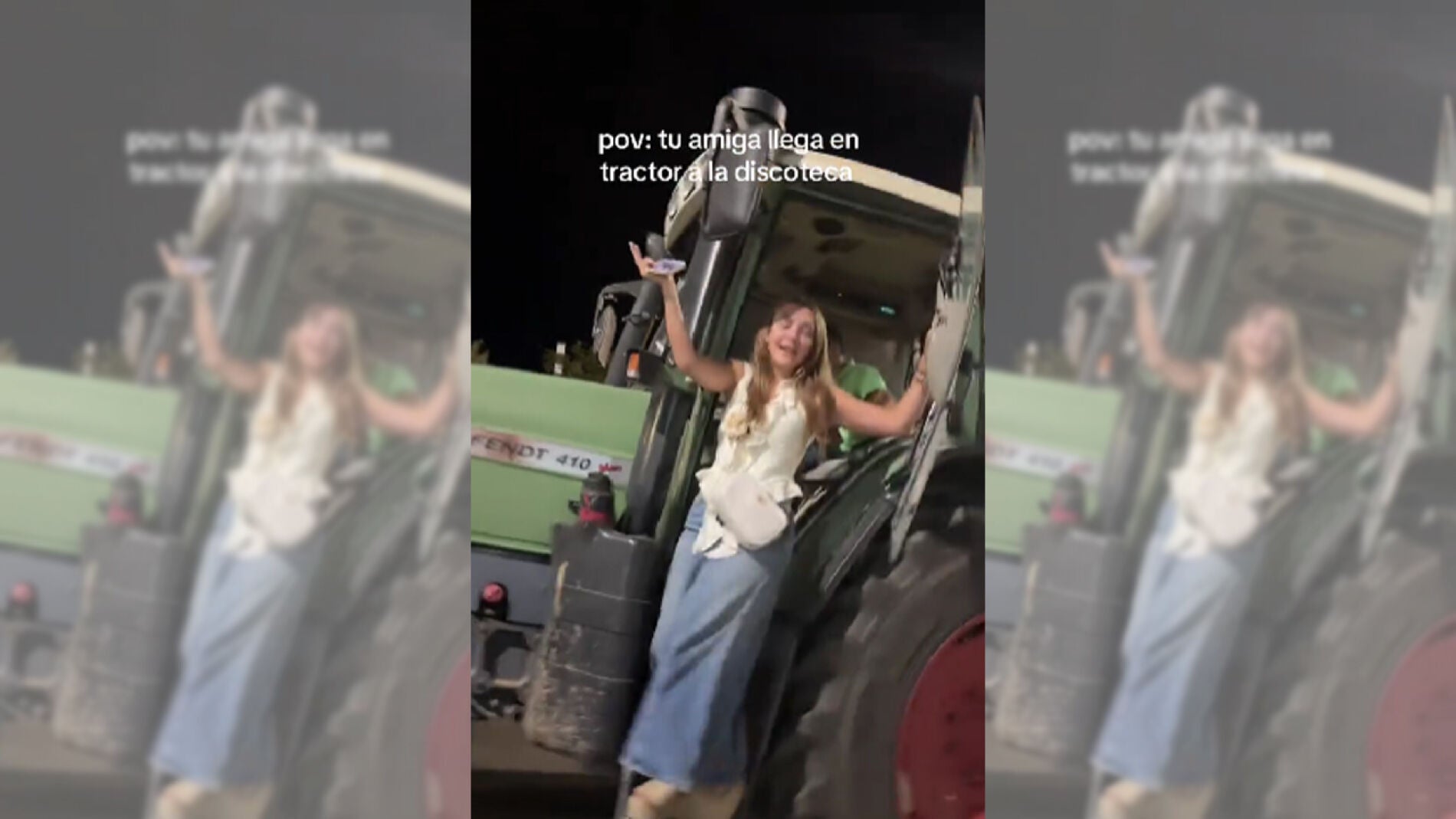 La escena dura apenas unos segundos, pero ha bastado para conquistar a las redes. En un vídeo que ya acumula cientos de miles de visualizaciones, una joven aparece llegando a la puerta de una discoteca subida a un tractor agrícola de la marca Fendt, conducido por un chico. Al detenerse el vehículo, ella se baja con total seguridad y estilo, como si fuera lo más normal del mundo.