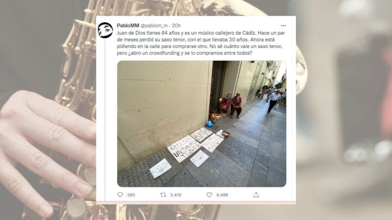 Así, un chico ha dado a conocer en Twitter la situación de un músico callejero que pedía ayuda para comprar un saxofón, su instrumento de trabajo que había perdido hace meses. A través de un tuit que ya ha alcanzado más de 9.000 likes y más de 3.000 retuits, el usuario @pablom_m escribía: "Juan de Dios tiene 64 años y es un músico callejero de Cádiz. Hace un par de meses perdió su saxo tenor, con el que llevaba 30 años. Ahora está pidiendo en la calle para comprarse otro. No sé cuánto vale un saxo tenor, pero ¿abro un crowdfunding y se lo compramos entre todos?".