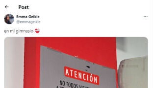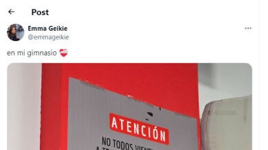Este es el cartel colocado en el gimnasio Center Up, de Villanueva de la Cañada (Madrid) y que se ha vuelto viral después de que lo subiera a Twitter @emmageikie donde ha acumulado 46.000 me gusta y 4.000 retuits.
