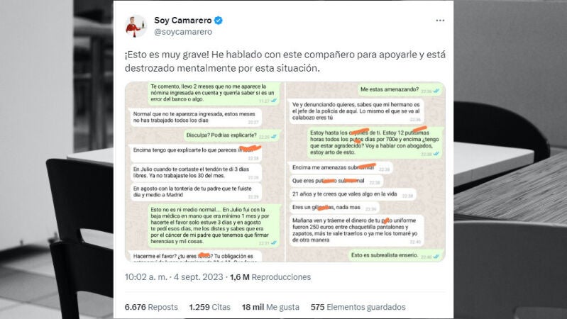 Un joven camarero de 21 años estaba siendo claramente abusado laboralmente por su jefe que no le había pagado las dos últimas nóminas y que además se dedicaba a insultarle y hasta amenazarle. Completamente destrozado decidió compartir lo sucedido con @soycamarero para que lo compartiera por redes sociales y así hacer algo de ruido sobre la terrible situación que estaba viviendo.
