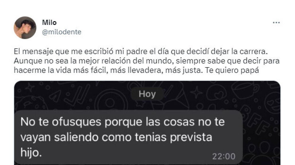 "El mensaje que me escribió mi padre el día que decidí dejar la carrera. Aunque no sea la mejor relación del mundo, siempre sabe que decir para hacerme la vida más fácil, más llevadera, más justa. Te quiero papá", afirma @milodente.en un tuit que cuenta con casi más de 3 millones reproducciones, más de 30.000 me gusta y más de 300 comentarios.