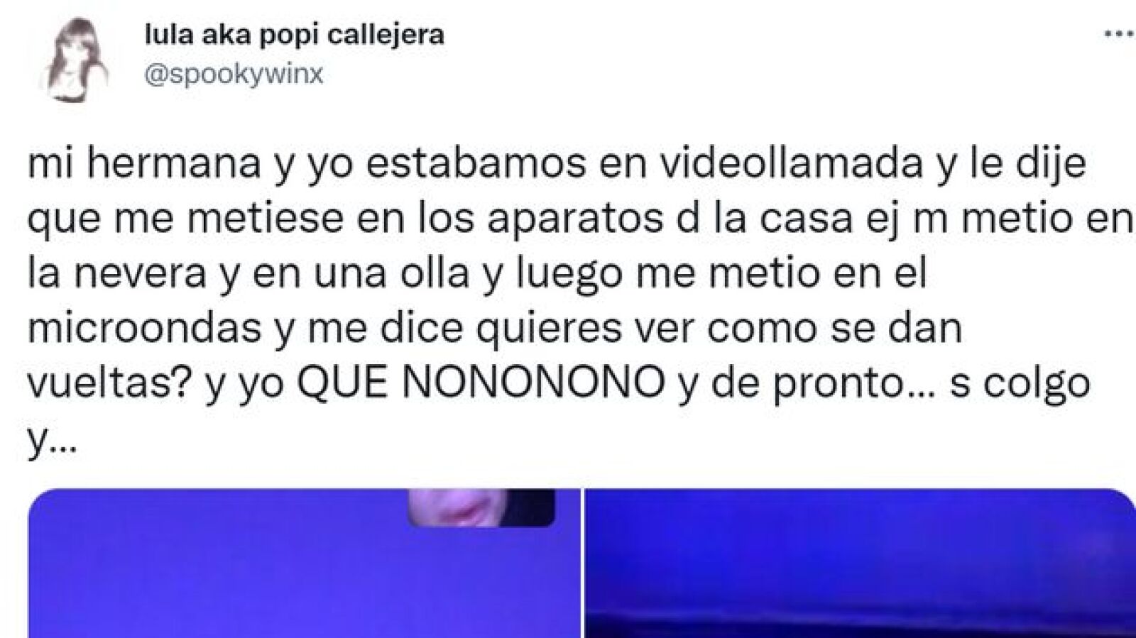 "Mi hermana y yo estábamos en una videollamada y le dije que me metiese en los aparatos de la casa. Me metió en la nevera y en una olla y luego me metió en el microondas, me dijo si quería ver cómo dan vueltas. Yo le dije que NONONONO y de pronto… se colgó", escribió la joven.