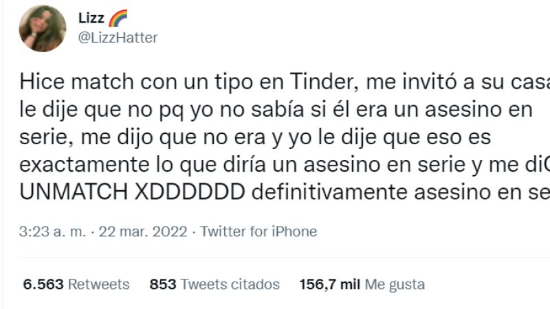 El final de esta bonita historia acabó con que el chico decidió hacer unmatch, cansado probablemente de las acusaciones en las que Lizz le catalogaba como un asesino en serie. Por la parte de Lizz, también reaccionó al unmatch: "definitivamente era un asesino en serie". La historia se quedó en una curiosa y divertida anécdota con nada más y nada menos 150 mil likes en menos de dos días. En la que ninguna de las partes tuvo la coordinación necesaria para poder dar el siguiente paso, conocerse en persona. Y es que muchas veces nuestro lenguaje en las redes puede atrae o desagradar a una persona, al fin y al cabo, vivimos en una sociedad digital a la que debemos adaptarnos. Y muchas veces es más importante la forma en la que expresamos el mensaje, que el propio mensaje.