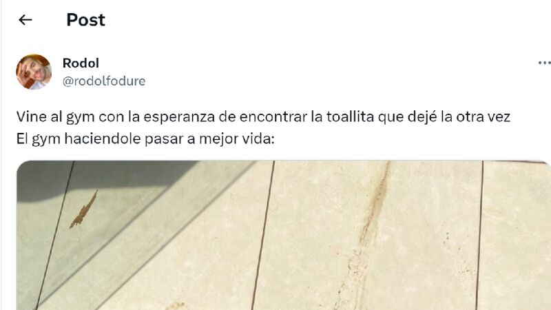 "Vine al gym con la esperanza de encontrar la toallita que dejé la otra vez", cuenta el usuario. Y a continuación dice: "El gym haciéndole pasar a mejor vida:", y adjunta una imagen.