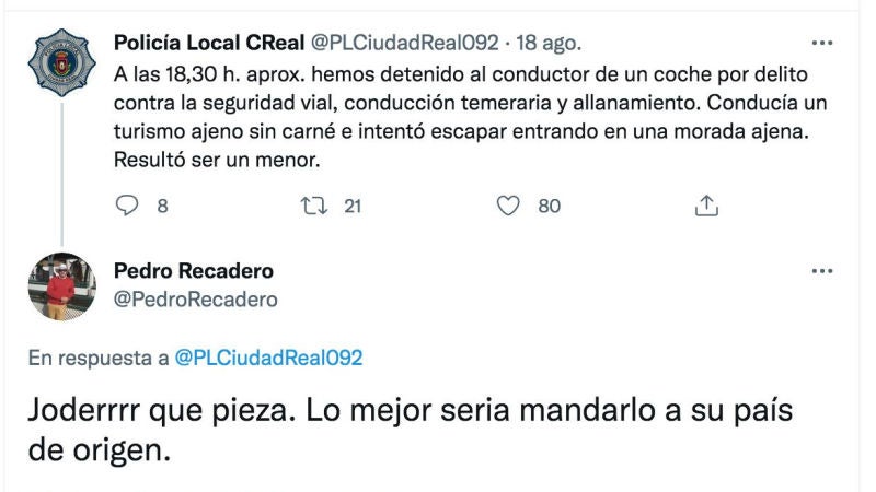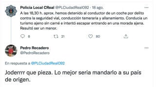 La demoledora respuesta de la policía de Ciudad Real a un tuit racista