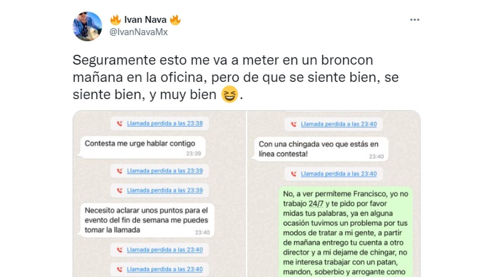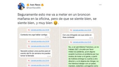 "No, a ver, permíteme, Francisco, yo no trabajo 24/7 y te pido que, por favor, midas tus palabras, ya en alguna ocasión tuvimos un problema por tus modos de tratar a mi gente, a partir de ahora entrego tu cuenta a otro director y a mi déjame de chingar. No me interesa trabajar con un patán, mandón, soberbio y arrogante como tú. Que tengas buenas noches", sentenció Iván antes de bloquear a Francisco.