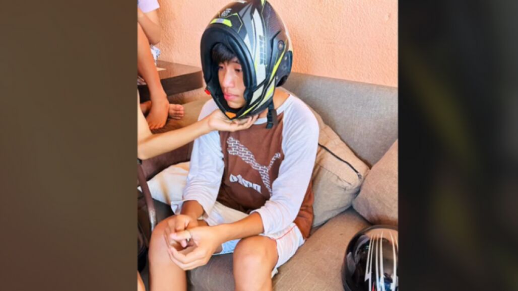El sobrino asustado se le puede ver y escuchar la cara de preocupación que tiene: "No me sale", afirmaba el joven a la vez que hacía fuerza para quitarse el casco.