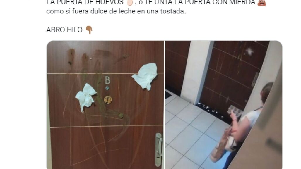 "En mi edificio tenemos una señora que, de la nada y porque sí, TE LLENA LA PUERTA DE HUEVOS, o TE UNTA LA PUERTA CON MIERDA como si fuera dulce de leche en una tostada", escribió Chino en un tuit que ya acumula 100.000 'me gusta', 11.000 retuits y más de 2.000 comentarios.