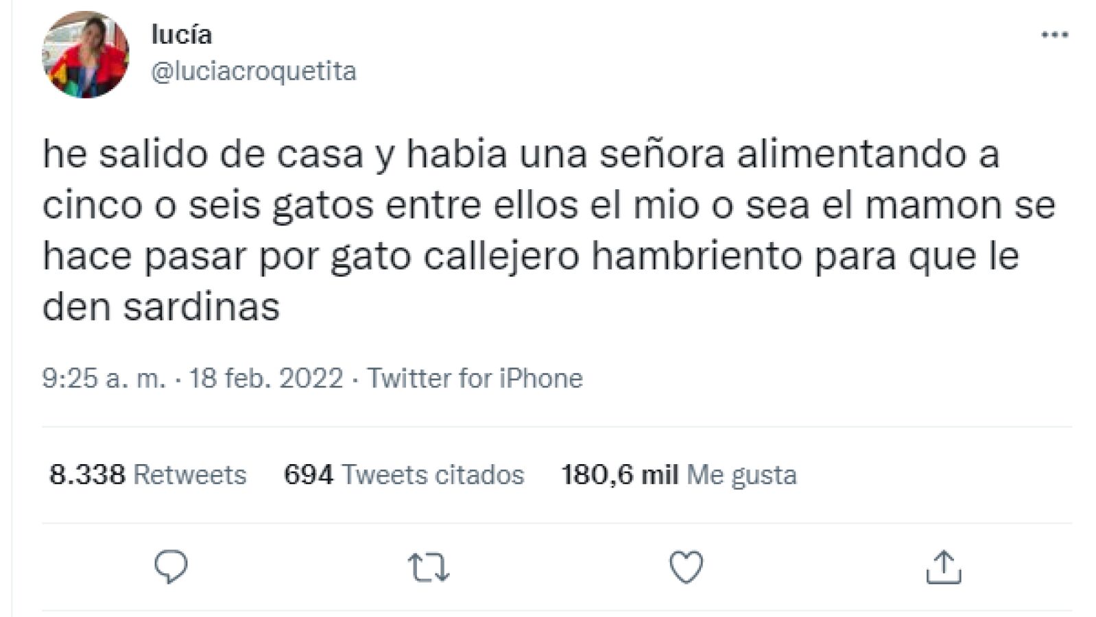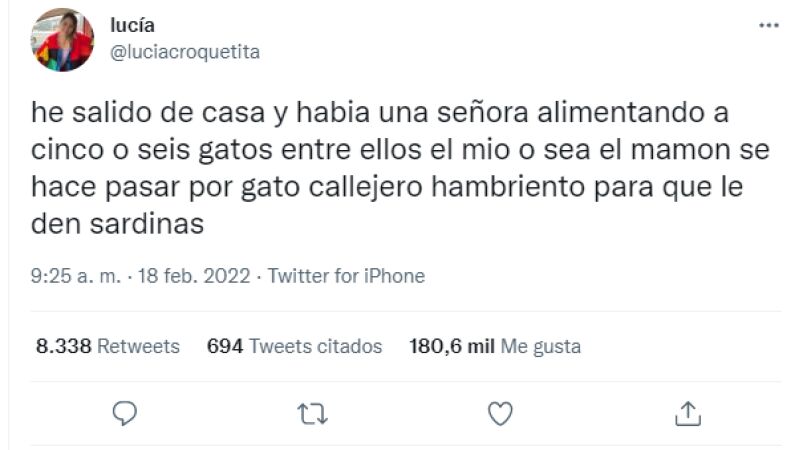 La historia viral del gato fue contada por Lucía, su dueña, a través de redes sociales. Lucía, la dueña del gato, descubrió el engaño de su mascota por una simple casualidad. Cuando ella salió de casa, vio que una señora estaba alimentando a seis gatos de la calle. Cuál fue su sorpresa al descubrir que su gato estaba entre los callejeros que comían desesperados: "He salido de casa y había una señora alimentando a cinco o seis gatos entre ellos el mío".