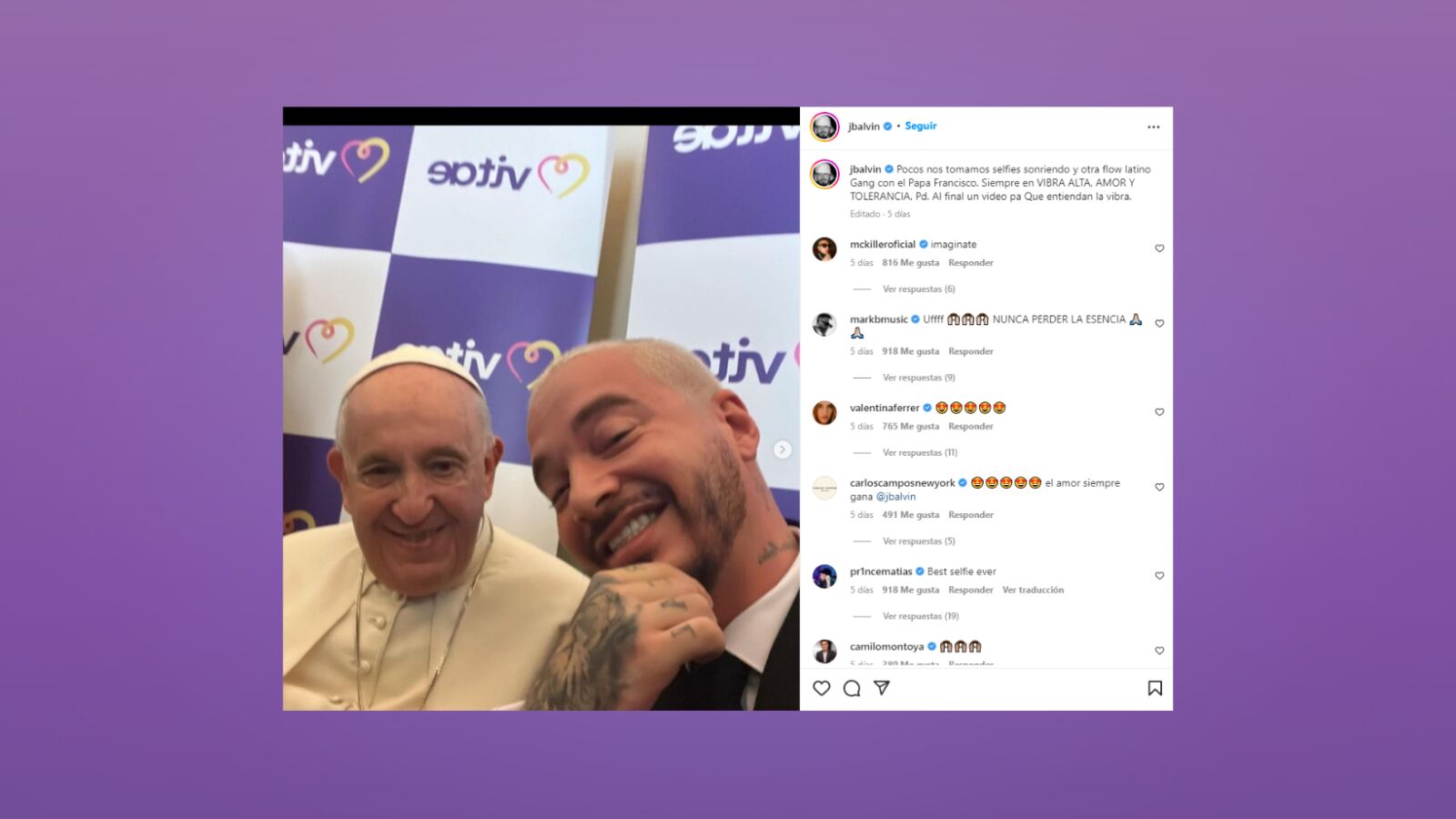 Aunque parezca de lo más surrealista, lo cierto es que en el carrusel de imágenes que subió, se puede ver la conexión entre los dos y lo bien que se llevan. De hecho, el propio J Balvin escribía: "Pocos nos tomamos selfies sonriendo y otra flow latino Gang con el Papa Francisco. Siempre en VIBRA ALTA, AMOR Y TOLERANCIA".