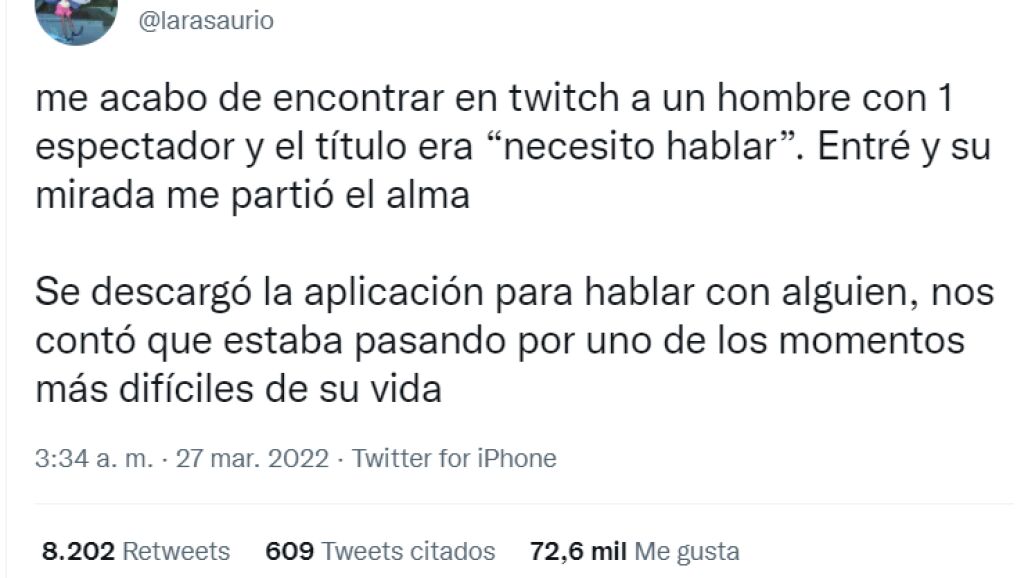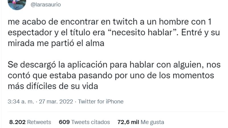 "Me acabo de encontrar en Twitch a un hombre con 1 espectador y el título era "necesito hablar". Entré y su mirada me partió el alma. Se descargó la aplicación para hablar con alguien, nos contó que estaba pasando por uno de los momentos más difíciles de su vida", escribió esta usuaria de Twitter. Ese mensaje supera ya los 72 mil likes y ha tenido muchos comentarios e interacciones.