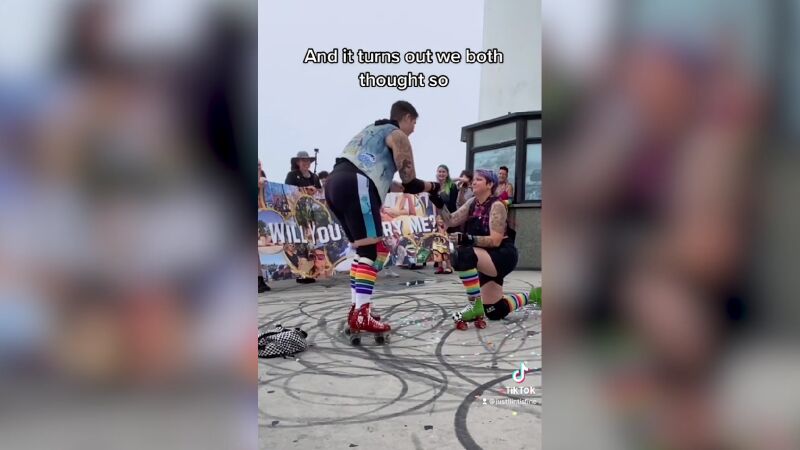El vídeo, que puedes ver arriba, muestra a la pareja patinando a lo largo del paseo marítimo de una ciudad costera californiana. En un momento dado, Flint, de 32 años, se arrodilla y le propone matrimonio a Sarah-Jean, de 34.