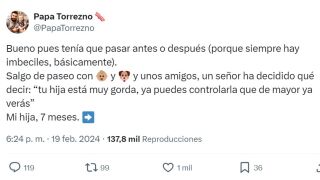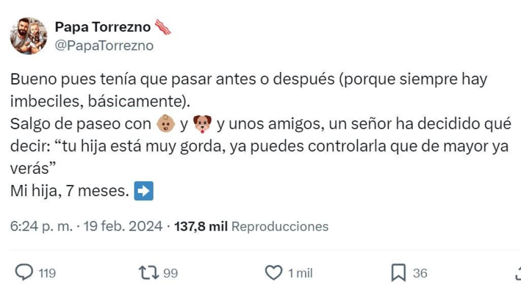 Esta historia no ha pasado desapercibida para nadie. El tuit principal ha superado las 137,8 mil reproducciones y muchos usuarios han querido apoyar a este padre con algunos comentarios como "Me pasó, pero al revés, una madre me que mis hijos estaban extremadamente delgados que daba pena verlos" o "Pero que coño tiene que opinar la gente del físico de un bebé o de nadie? De verdad la gente debería aprender a cerrar la boca".