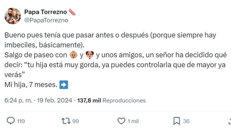 Explica que había salido de paseo con su hija, su perra y unos amigos cuando un hombre le dice "tu hija está muy gorda, ya puedes controlarla que de mayor ya verás". Como es normal, este comentario hacia la niña de tan solo 7 meses le ha molestado mucho al padre. Lo que cuenta que sucedió después no nos extraña para nada.