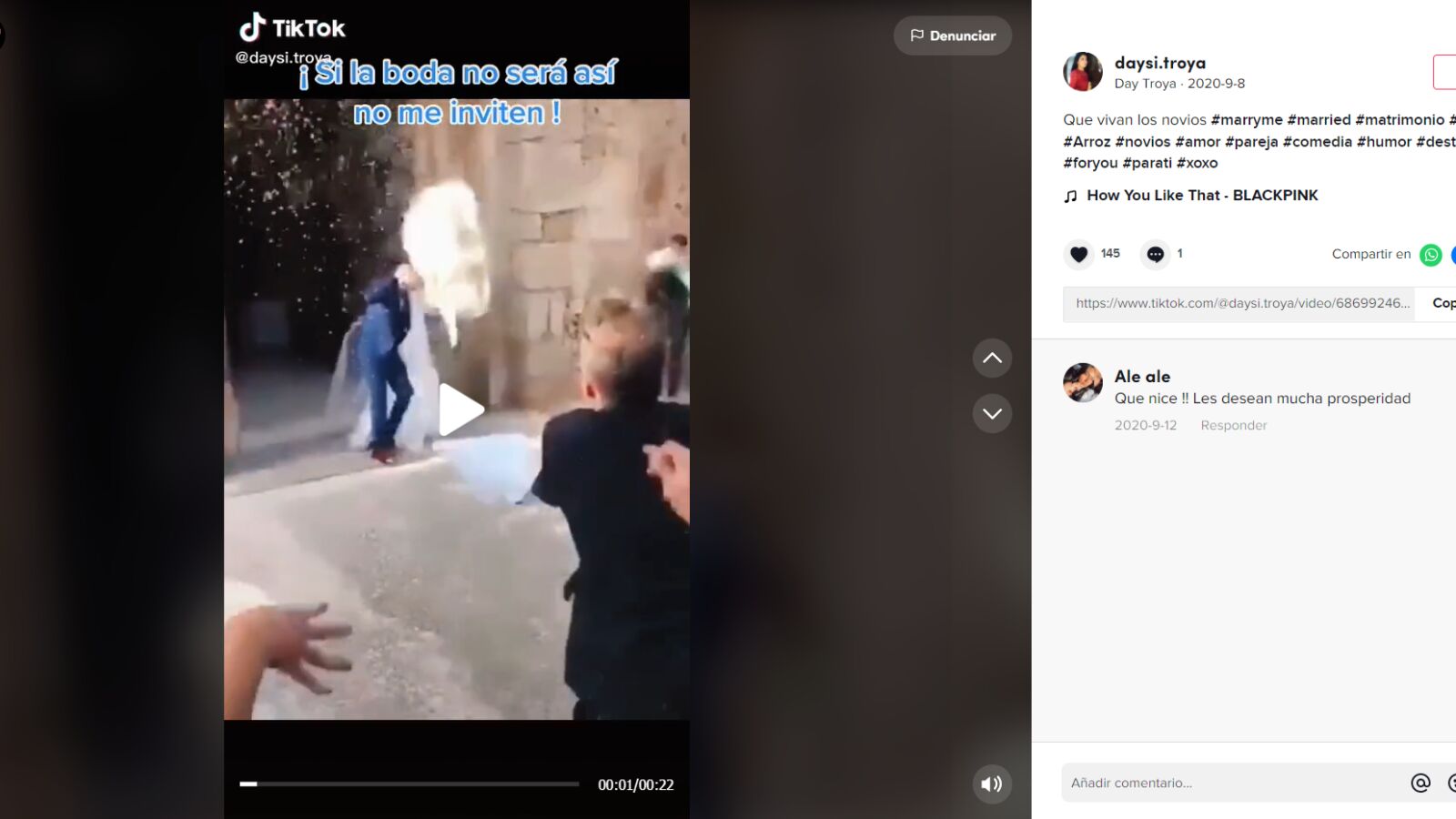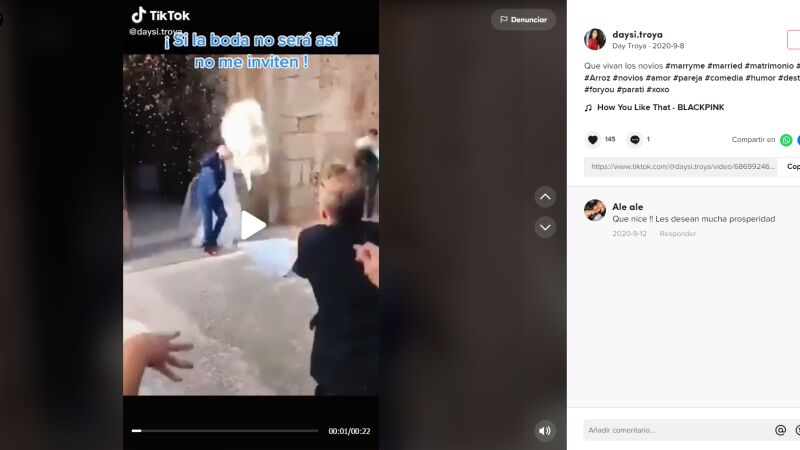 Luego de aceptar unir sus vidas en matrimonio, los recién casados suelen ser recibidos con arroz, que simboliza la fertilidad y la abundancia. Sin embargo, un video viralizado en TikTok mostró cómo un grupos de amigos les dio una efusiva bienvenida a los esposos y, con la ayuda de palas, los bañó en grandes cantidades de arroz.