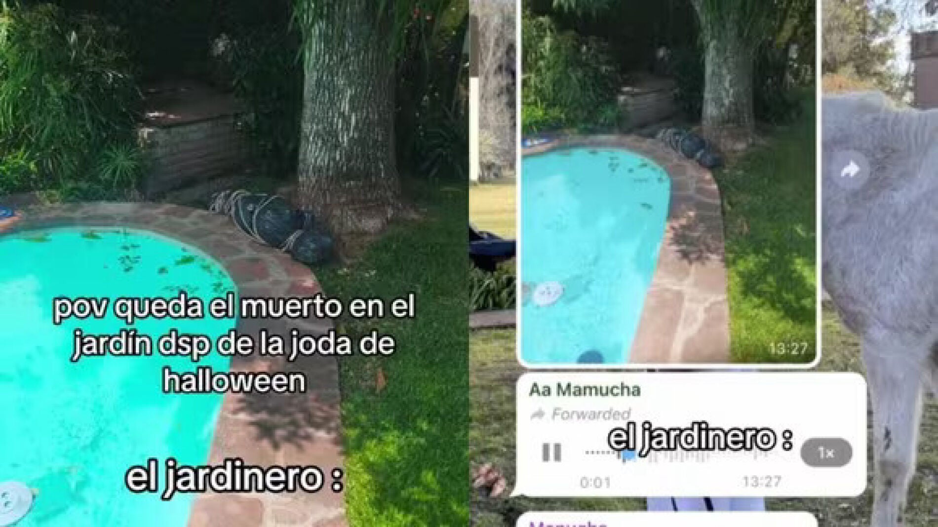 La familia de la tiktoker @usernameassandr1 se olvidó de quitar todas las decoraciones de Halloween del jardín y cuando fue el jardinero se llevó un tremendo susto por lo que encontró junto a la piscina. El vídeo con lo que le dice por WhatsApp el jardinero lo han visto 11 millones de personas.