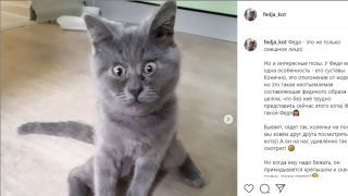 Debido a sus complicaciones en los ojos, el gato tiene una graciosa expresión que llevó a Natalia Zhdánova a abrirle una cuenta en diferentes redes sociales con el nombre de @fedja_kot. Con apodos como 'El sorprendido', el animal ha conseguido meterse en el bolsillo a miles de espectadores que le siguen cada día.