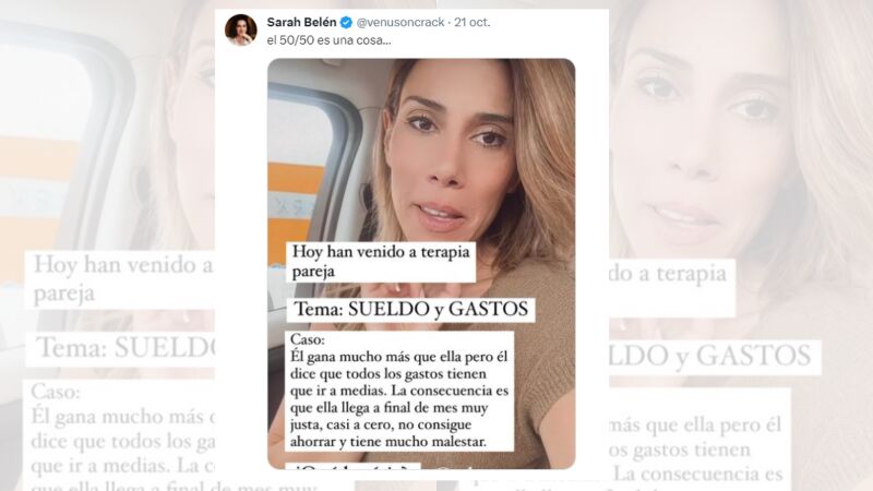 Esto es algo que ha empezado a raíz de la publicación de una psicóloga, la cual ha preguntado en redes qué es lo que opinan sobre el problema que tiene una pareja que ha ido a su consulta, en el cual "él gana mucho más" pero quiere que paguen todo a medias. Esto es algo que resulta un problema para la chica, ya que a raíz de esto llega a fin de mes "casi a cero", por lo que no consigue ahorrar, algo que le genera mucho malestar.