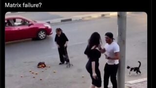 Todo por la historia que destaca en su timeline y que va de una pareja en mitad de una pelea claramente sobreactuada. Lo que sí da verosimilitud a la escena es ver a una señora mayor cruzando entre el muy denso tráfico, que se le cae una bolsa de naranjas y hasta aparece un gato curioso por los cítricos rodando por el asfalto.