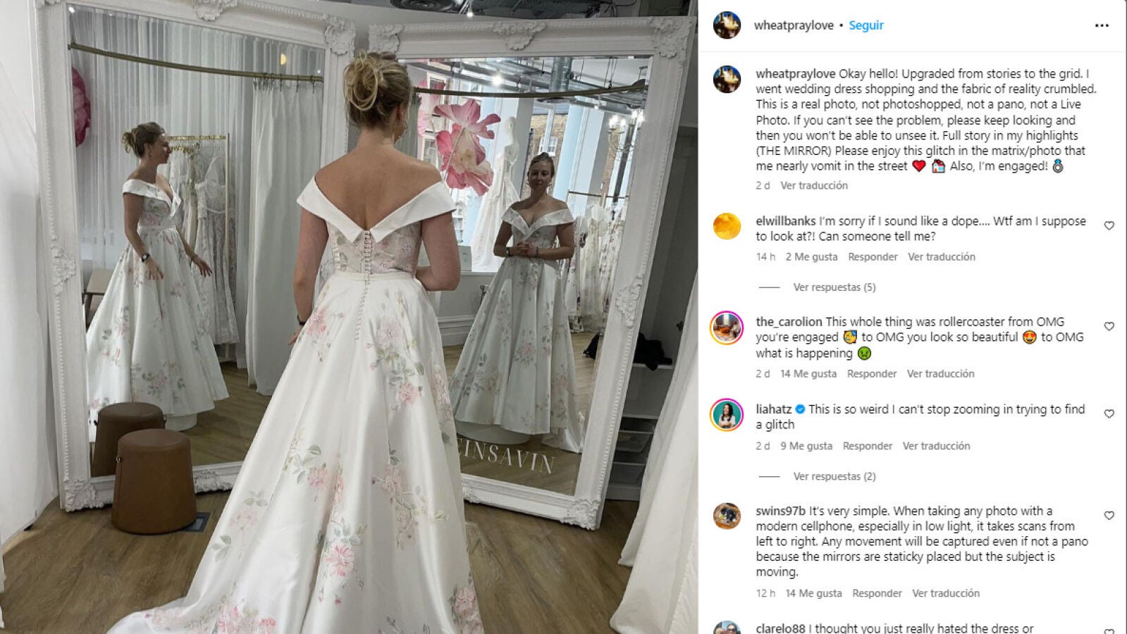 "Fui a comprar un vestido de novia y el tejido de la realidad se desmoronó. Esta es una foto real, no retocada con Photoshop, ni una panorámica, ni una Live Photo", subtituló la imagen.