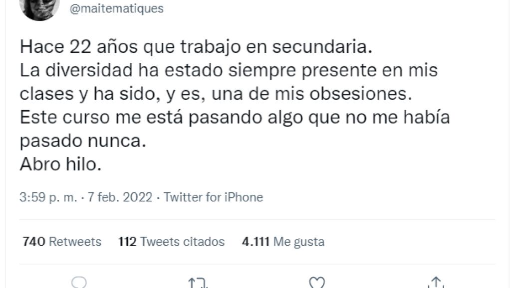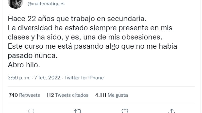 La tuitera y profesora de Matemáticas en un instituto Maite Alejandre ha contado en Twitter lo que está viviendo este año en una de sus clases con un alumno con un alumno con "un diagnóstico de varias dificultades que fueron detectadas muy pronto".