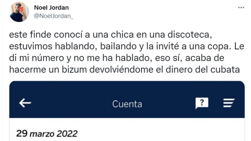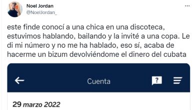 El joven llamado en las redes sociales como @NoelJordan_ , contó la historia que vivió, cuando invitó a una chica a una copa. Comenta que después de charlar y bailar un rato con ella en la discoteca, el decidió darla su número. Lo que no se hubiera esperado nunca es que la chica en vez de hablarle, le pagó los 8,5 euros del coste de la copa. El joven sorprendido, ha comentado por Twitter: "Este finde conocí a una chica en una discoteca, estuvimos hablando, bailando y la invité a una copa. Le di mi número y no me ha hablado, eso sí, acaba de hacerme un bizum devolviéndome el dinero del cubata". Las reacciones no han tardado en llegar, y el tweet cuenta en apenas 20 horas con más de 426 Tweets citados y 12,2 mil likes.
