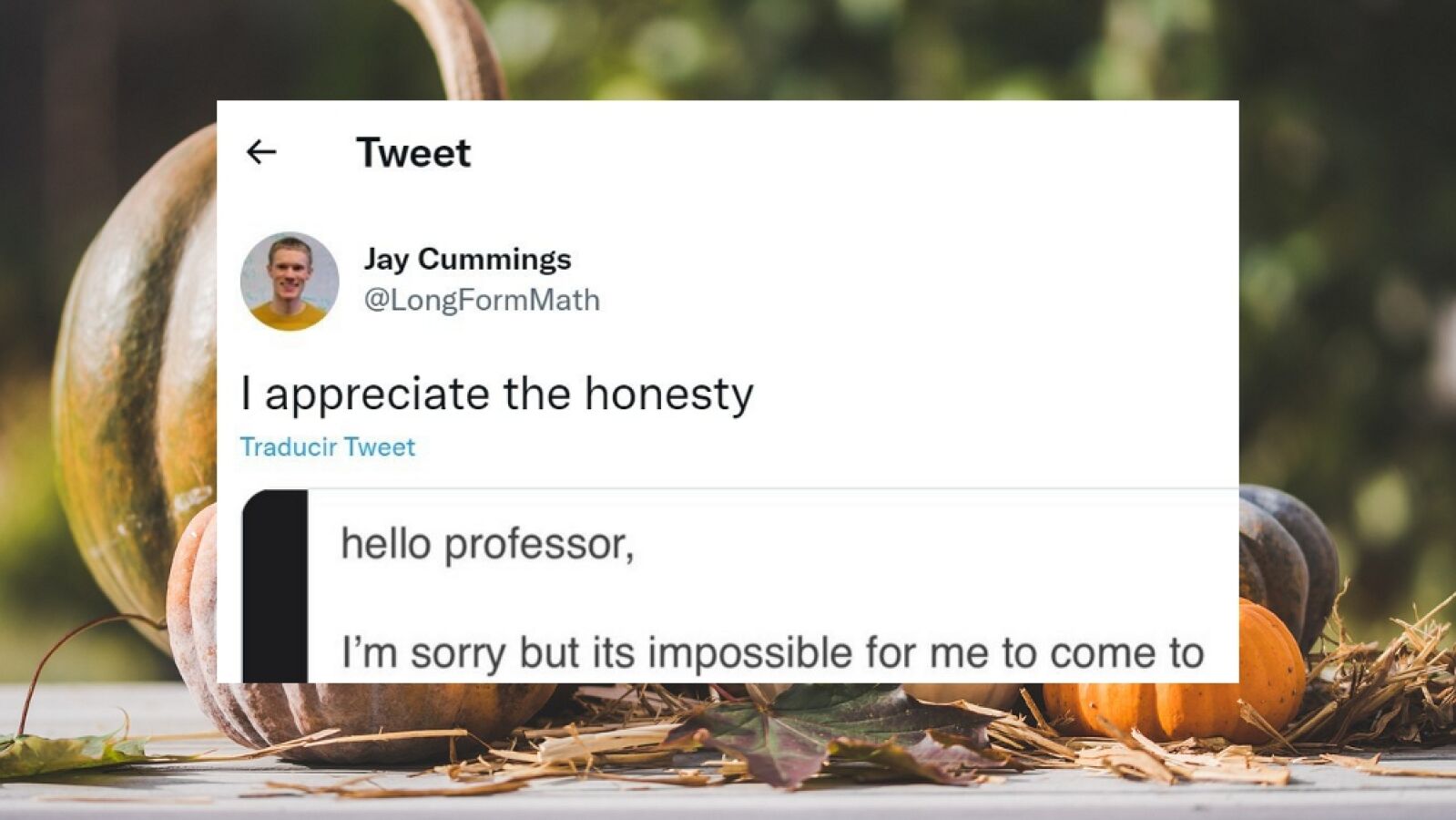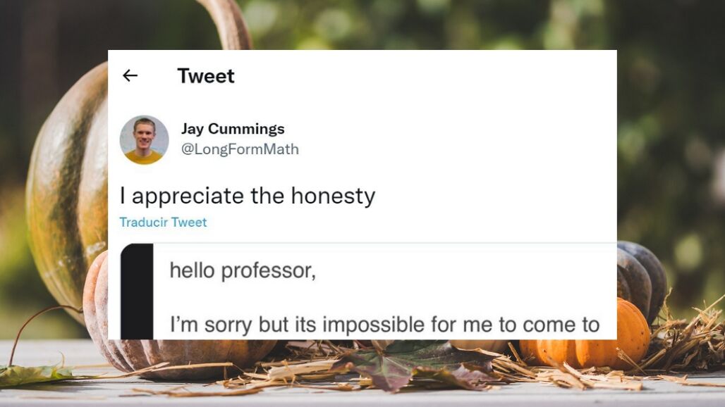 Jay Cummings, profesor de matemáticas de la Universidad Estatal de Sacramento, decidió compartir en Twitter el "honesto" correo electrónico que uno de sus alumnos le había enviado para explicar por qué no iba a ir a clase tras haber celebrado una fiesta de Halloween.