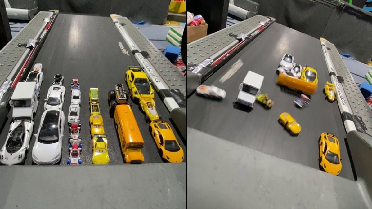 Este entretenido vídeo presenta una carrera sobre una cinta de correr entre coches de juguete amarillos y blancos. El vehículo que supere a todos los demás en la máquina saldría victorioso.
