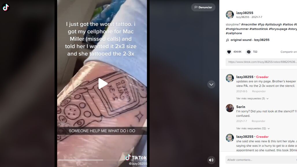 Sucede que el artista no le había entendido bien y terminó realizando un trabajo distinto al deseado. "Me acabo de hacer el peor tatuaje de mi vida. Me dieron el teléfono de Mac Miller y le dije que lo quería en tamaño 2 por 3. Me ha tatuado el 2 por 3. ¿Cómo lo arreglo?", expresó la tiktoker, cuyo video superó las 3 millones de reproducciones.