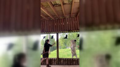 Una leona aparece por sorpresa para ayudar a una limpiadora a dejar los cristales del zoo impecables