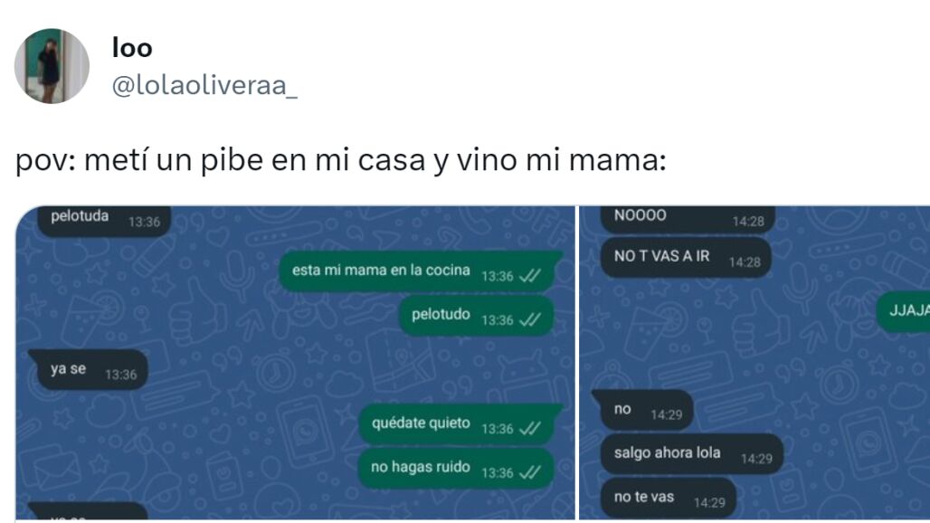 "Está mi mama en la cocina, pelotudo", le reprocha. "Quédate quieto, no hagas ruido", añade. En las respuestas, la tuitera aclara que es precisamente en la cocina donde estaba escondido el chico, por lo que en ese momento estuvo muy cerca de encontrarle.